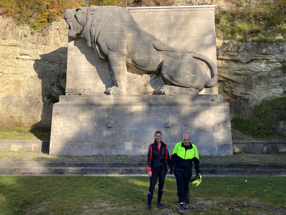 Back on the trail, I was grateful for every calorie, as we started a rather challenging ascent. There were two castles on a ridge line nearby, and up ahead we would have to make a choice. Did we want to go all the way up, or stay on the river path. Ron and I didn't hesitate: the river path is fine! It wasn't long until we reached the turnoff - a bridge that would take us across the river we had been following, so that we could skirt the mountain. But the bridge had been taken down! We no longer had a choice. Up we went. It was so steep in parts that we had to dismount and literally push, pull and drag our bikes along. But we were rewarded handsomely! First, the lion monument welcomed our show of strength.